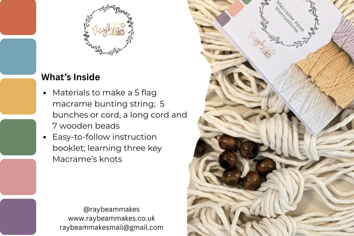 Bring a touch of handmade charm to your home with our Macramé Bunting Kit. Designed for beginners, this DIY kit provides all materials to make a string of 5 bunting flags, with a choice of colours to match your décor or gifting needs.