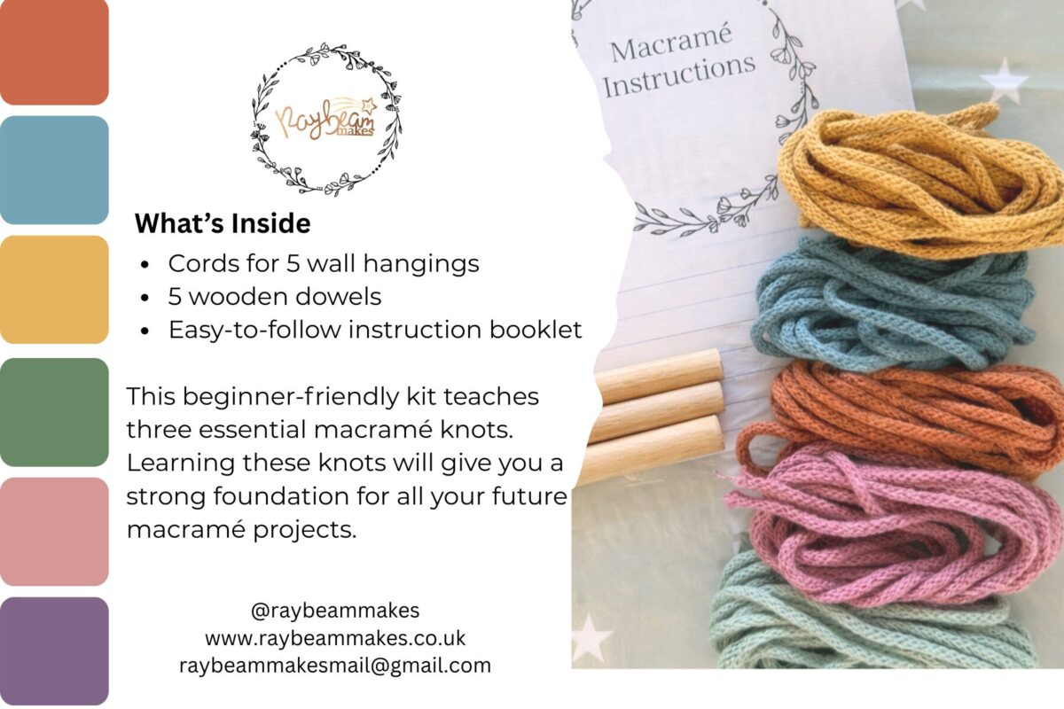 Bring handmade charm to your home with our Macramé Wall Hanging Kit. Designed for beginners, this kit includes cords for 5 wall hangings, 5 wooden dowels, and a clear instruction booklet.