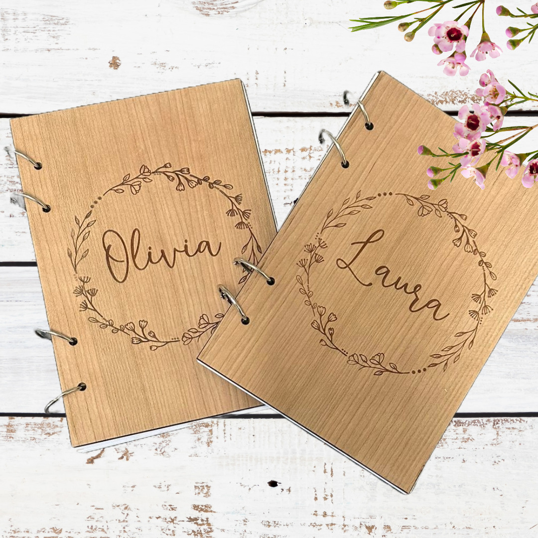 Capture your thoughts, ideas, and memories in a beautifully crafted personalised wooden keepsake notebook. This unique notebook features a stunning unique floral wreath design, expertly laser engraved on the cover, with the option to add custom wording that makes it truly yours. Perfect as a personal journal, a thoughtful gift, or a cherished keepsake, this notebook combines elegance with practicality.